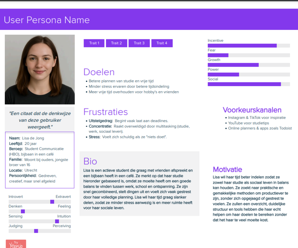 Lisa representeert een typische HBO-student die worstelt met timemanagement, een veelvoorkomend probleem onder jongeren tussen 15-25 jaar. Onderzoek toont aan dat ruim 60% van de studenten last heeft van uitstelgedrag en stress door slechte planning. Haar profiel sluit hier perfect bij aan: als communicatiestudent met een bijbaan en druk sociaal leven ervaart ze precies die balansproblemen waar de website oplossingen voor biedt.